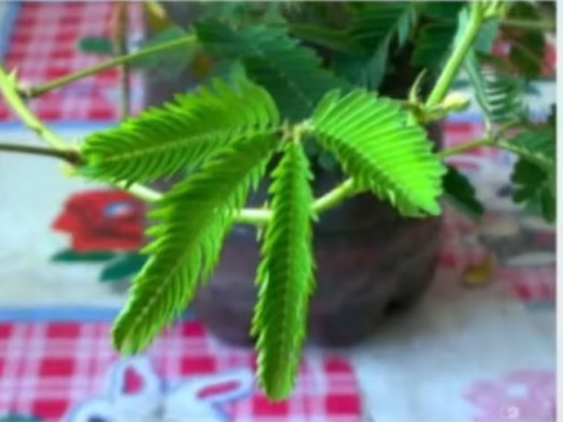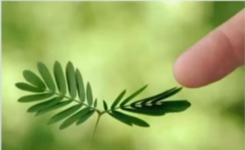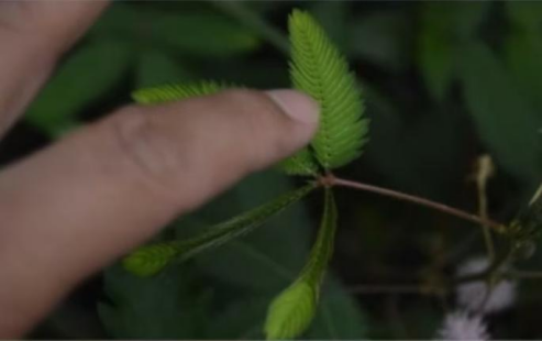 用手指轻轻触碰含羞草的叶片,叶片会迅速向内合拢,甚至整个叶柄也会下垂;若触碰力度较大,整株含羞草的叶片都会闭合,仿佛“害羞”一般。