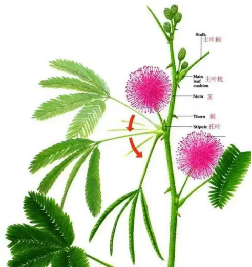 并非所有植物都有类似含羞草的应激反应,这种灵敏的反应与含羞草叶枕的特殊结构和细胞调节机制密切相关。其他一些植物(如合欢树、酢浆草)也有类似的叶片闭合现象,但反应速度和程度不如含羞草灵敏——合欢树的叶片会在夜晚闭合、白天展开(称为“感夜性”),主要由光照变化引发,而非触碰刺激;酢浆草的叶片在触碰时也会闭合,但反应速度较慢,闭合程度也较轻。