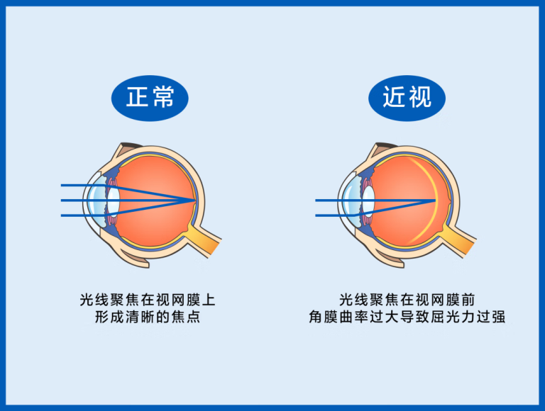 而近视的成因,正是由于眼睛的屈光系统(主要是晶状体)出现了问题,导致远处物体的像无法准确落在视网膜上。近视患者的晶状体通常比正常人更厚、更凸,对光线的折射能力过强;或者眼球的前后径过长,导致视网膜的位置靠后。这两种情况都会使远处物体反射的光线,经过晶状体折射后,提前汇聚在视网膜的前方,而不是准确落在视网膜上——因此,近视患者看远处物体时,看到的是模糊的图像,而看近处物体时,由于近处物体的光线发散程度大,晶状体的强折射能力仍能将像落在视网膜上,所以近处物体能看清。