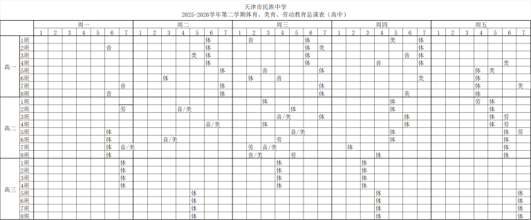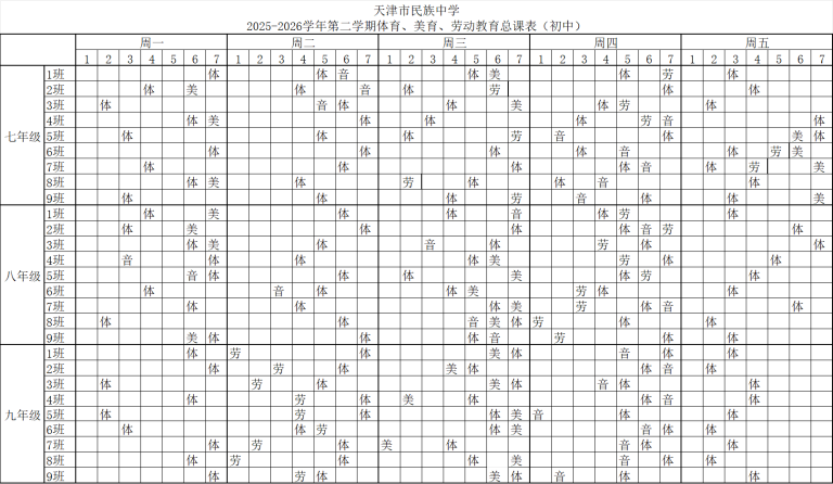 为深入贯彻中共中央国务院印发《教育强国建设规划纲要(2024-2035年)》提出的“落实健康第一教育理念,实施学生体质强健计划”,以及天津市教育两委印发《2025年天津市教育工作要点》(津教党〔2025〕6号)的工作要求,我校严格落实学校体育、美育、劳动教育等课程开设的刚性要求,按照国家课程方案和课程标准开齐开足上好体育、美育、劳动教育课,帮助学生掌握更多的运动技能,拥有更多的艺术特长。依据红桥区教育局关于开展中小学体美劳课“晒课表”活动的通知,特在学校微信公众号平台“晒课表” 如下,并接受社会监督。