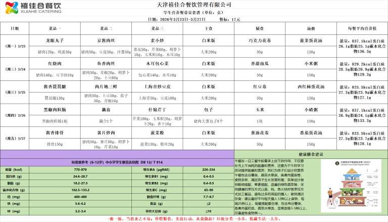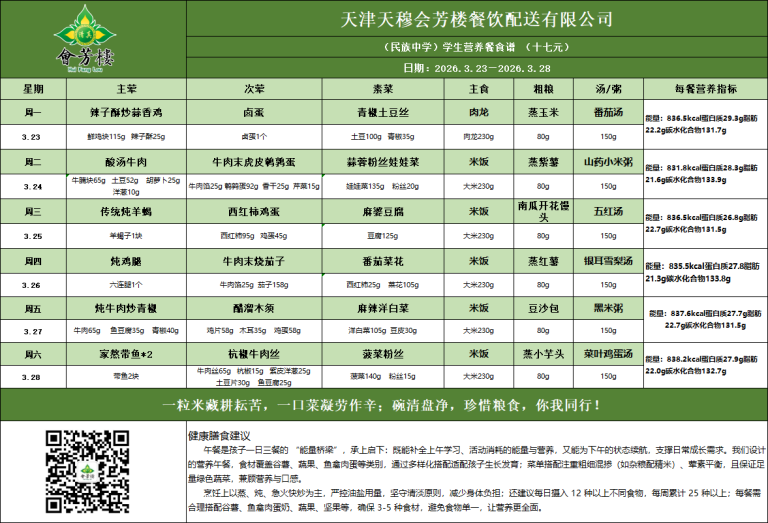 天津市民族中学第4周学生餐食谱公示