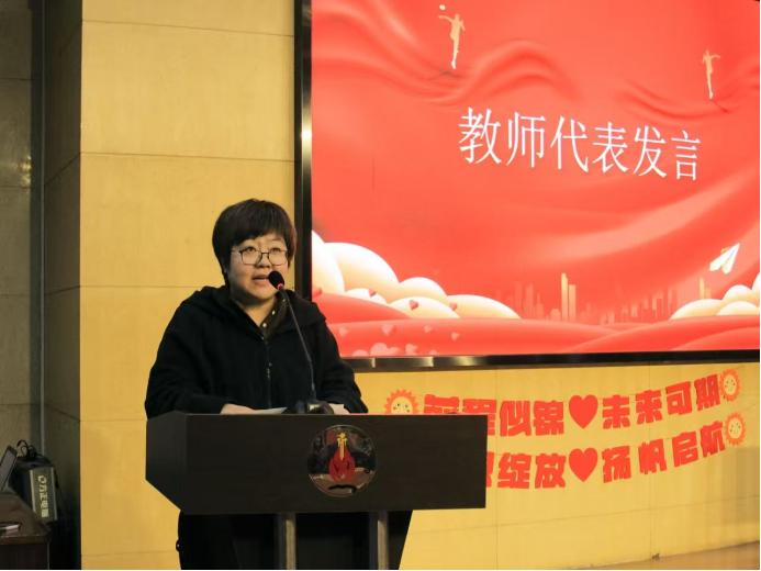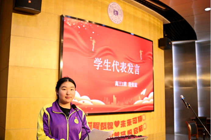 在庄严而温馨的氛围中,学生代表、高三(1)班段依辰同学上台发言,她回顾了三年求学路上的艰辛与收获,表达了全体高三学子迎战高考的坚定决心。“我们已不再是年幼孩童,而是勇敢的斗士。道路在脚下,胜利在前方!未来与希望必将在六月美丽夺目;汗水与泪水必将在六月结晶闪光!”她的发言振奋人心,也道出了同学们的共同心声。