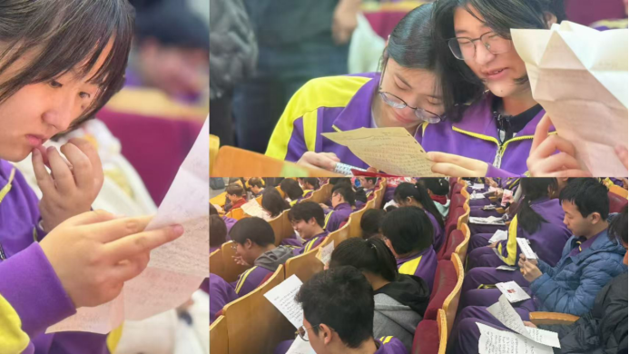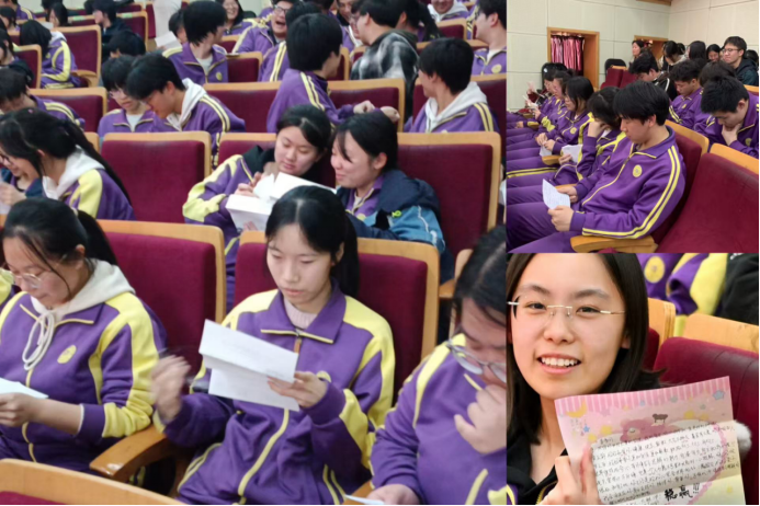 高三(2)班姜帝同同学的家长代表全体家长发言,道出了父母们的心声:“你们的成长离不开家校一体的完美结合,也离不开安宁祥和的社会环境,父母的关爱早已整装待发,我们一直是你们坚强的后盾。”在“送你一封信,听听我的心”特别环节中,家长与孩子以书信为舟,展开穿越代际的温柔对话。文字遇见亲情,笔尖的温度融化了时光,成为学子拼搏的不竭动力。