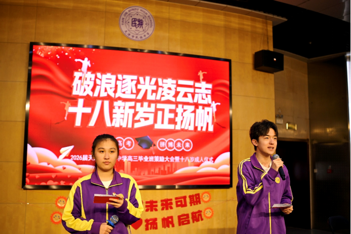 教师代表高三(2)班班主任冯昉老师的致辞饱含深情。“天涯海角有尽处,只有师恩无穷期。”在1000多个求学的日夜里,老师们始终与学子并肩作战。“十八而志,大任始承”,每一位民族高三学子都要学会感恩与担当,把个人的理想融入到家庭责任、社会进步和国家发展中去,成人礼的誓词不是一句空洞的口号,而是同学们未来人生的行为准则。大屏幕上,各科教师的祝福视频更是让同学们热泪盈眶——那些熟悉的面孔、温暖的话语,化作前行路上最坚实的力量。