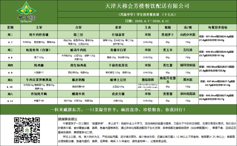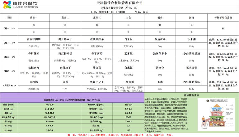 天津市民族中学第6周学生餐食谱公示